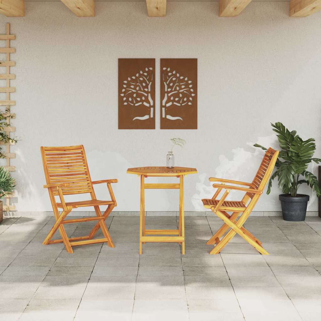 - Massief acaciahout: Deze rustieke opvouwbare bistroset is gemaakt van massief acaciahout en heeft een organische uitstraling. Het is super duurzaam, perfect voor buitengebruik en kan goed tegen dagelijks gebruik en slecht weer. De geoliede afwerking maakt het niet alleen mooier, maar helpt ook het hout te beschermen tegen vocht.