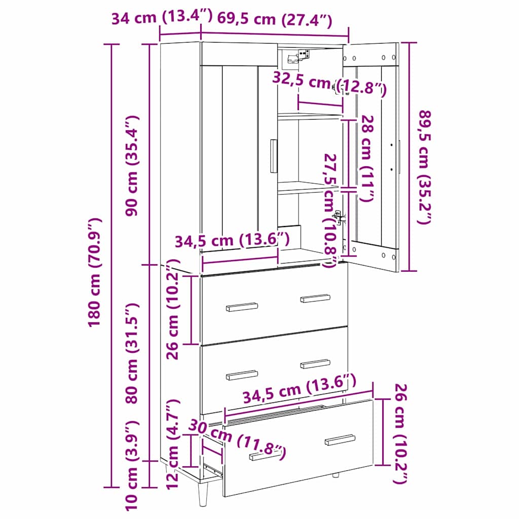 - Algemene afmetingen: 69,5 x 34 x 90 cm (L x B x H)