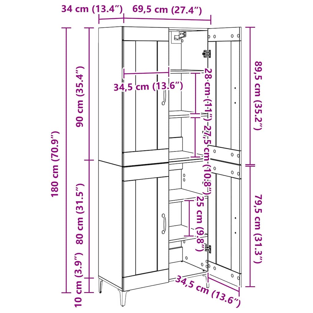 - Algemene afmetingen: 69,5 x 34 x 180 cm (L x B x H)