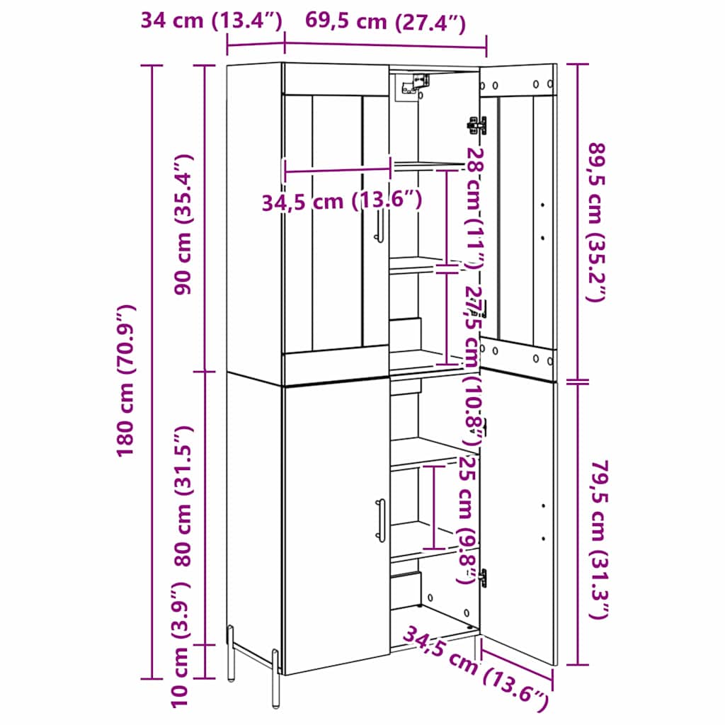 - Algemene afmetingen: 69,5 x 34 x 180 cm (L x B x H)
