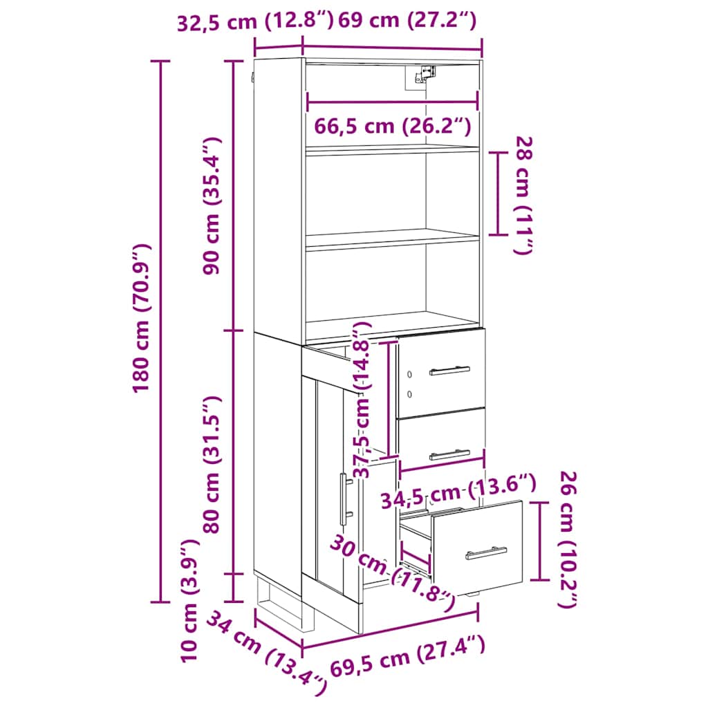 - Algemene afmetingen: 69,5 x 34 x 180 cm (L x B x H)