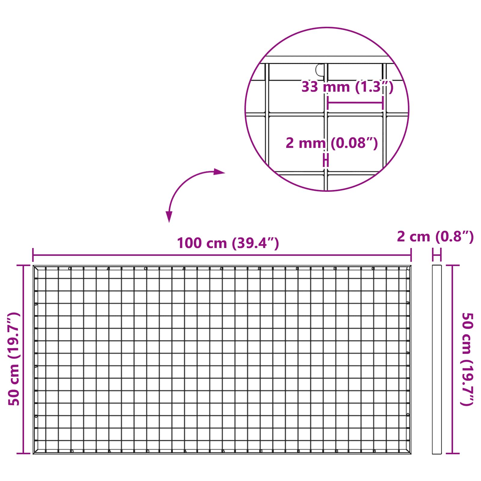 - Algemene afmetingen: 100 x 50 x 2 cm (L x B x H)