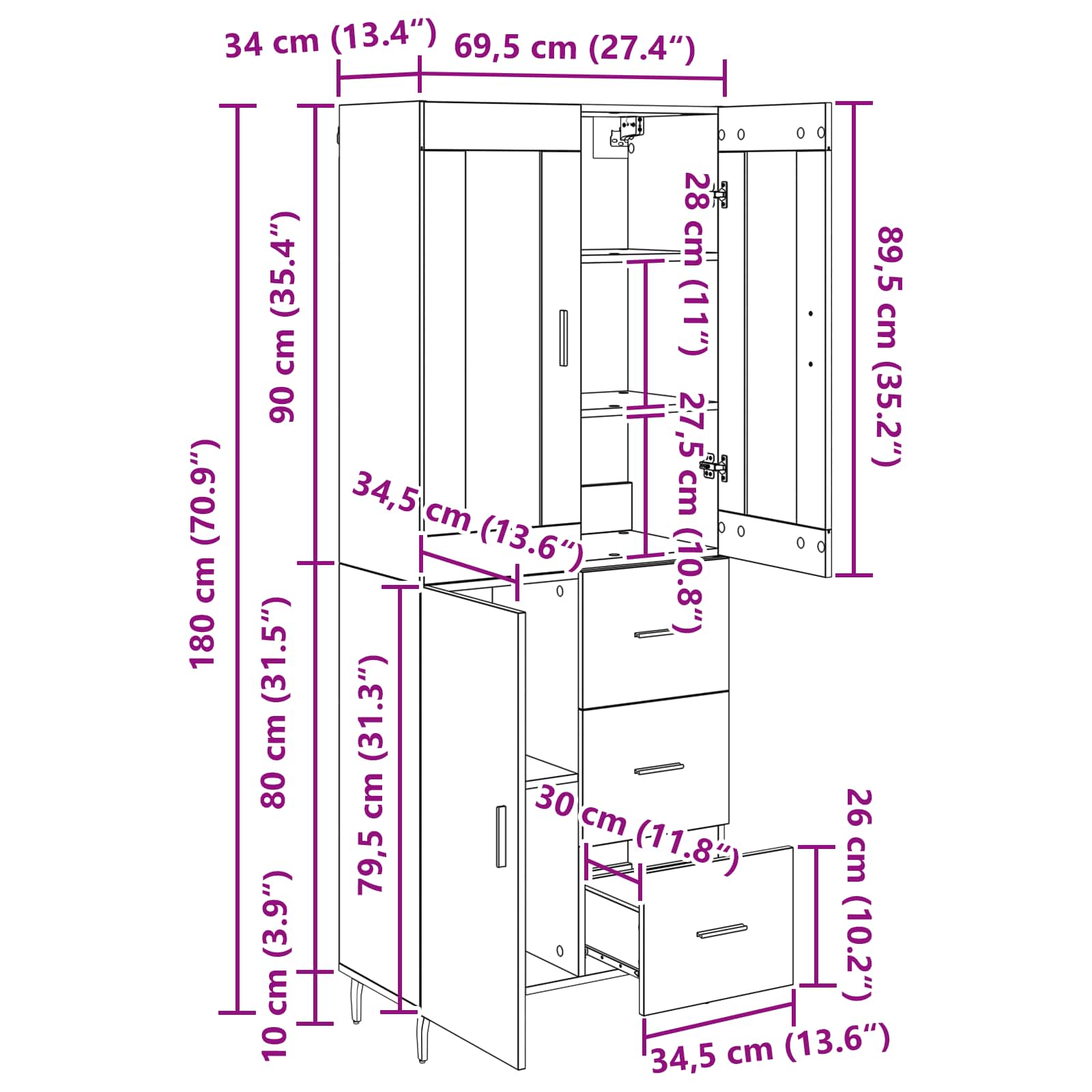 - Algemene afmetingen: 69,5 x 34 x 180 cm (L x B x H)
