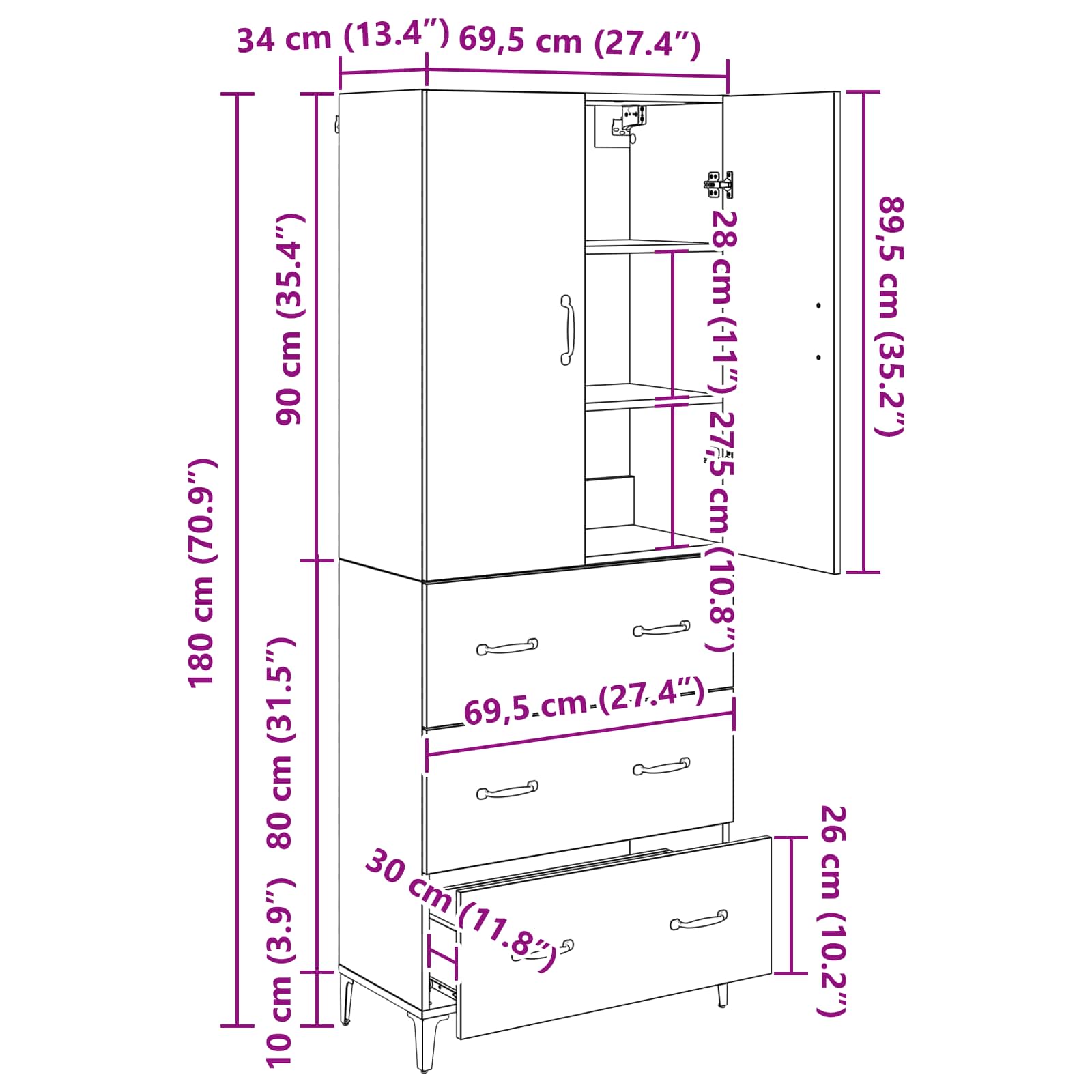 - Algemene afmetingen: 69,5 x 34 x 180 cm (L x B x H)