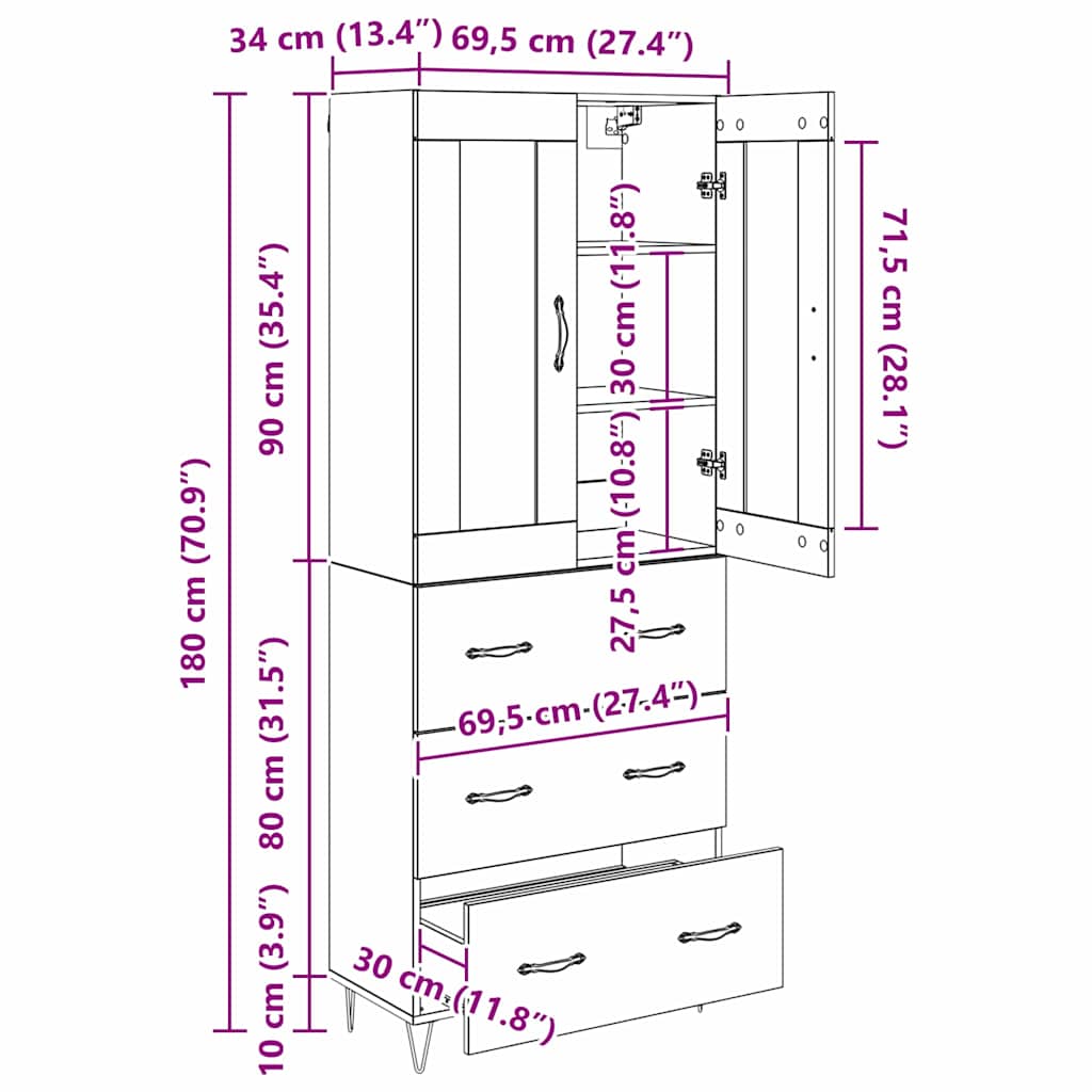 - Algemene afmetingen: 69,5 x 34 x 180 cm (B x D x H)