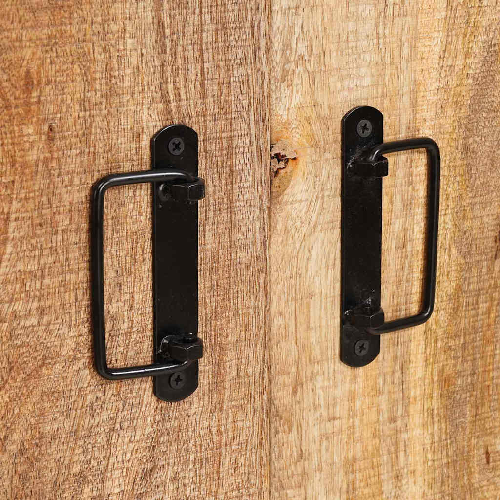 - Stijlvolle componenten: Het industriële ontwerp van de Highboard komt tot uiting in de metalen handgrepen en zwarte poten. Het zwart-brown contrast versterkt de uitstraling en zorgt ervoor dat het meubel goed past in verschillende decorstijlen zonder de bestaande elementen te overtreffen.