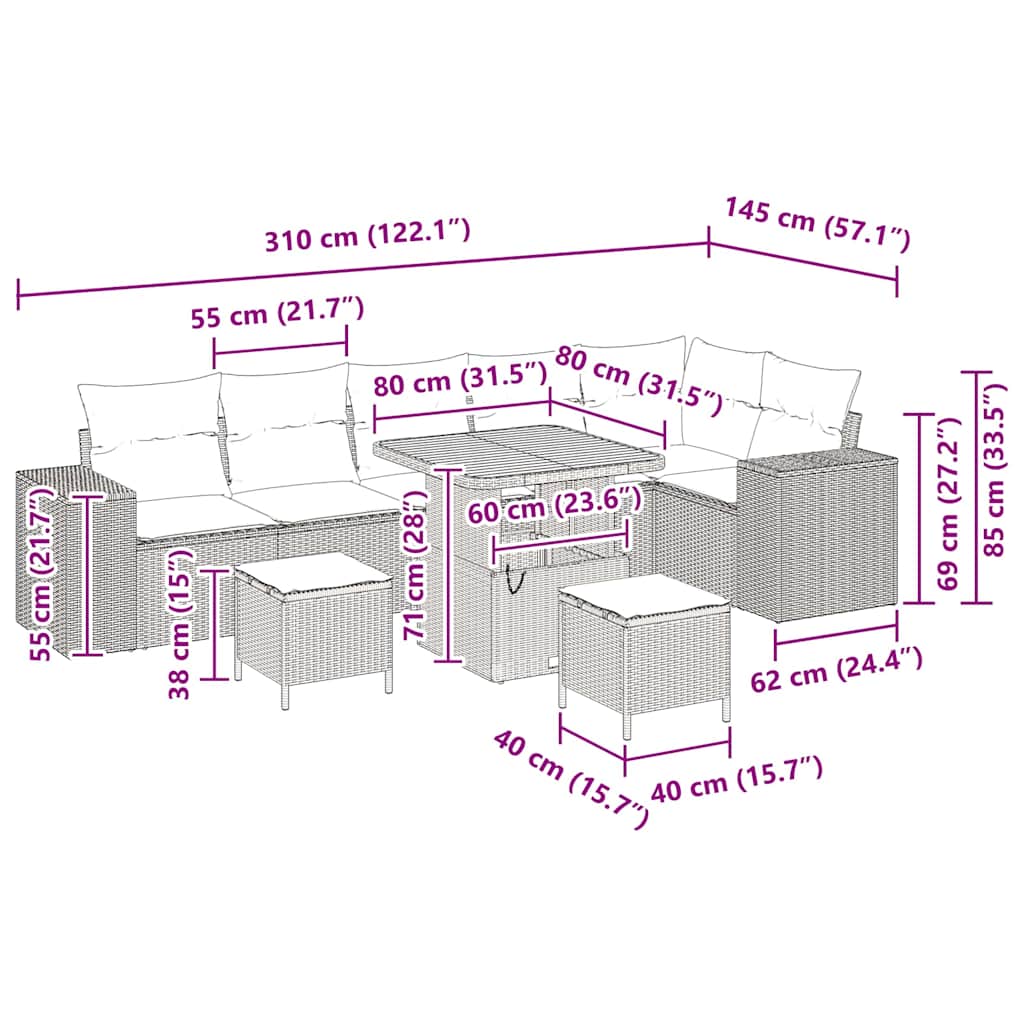 - Materialen: De bankset is gemaakt van stevig poly rattan, dat zowel stevig als stijlvol is. Dit materiaal is duurzaam en blijft mooi, ook als het in de zon of in de regen staat. Poly rattan maakt de set aantrekkelijk en praktisch, perfect voor buiten.