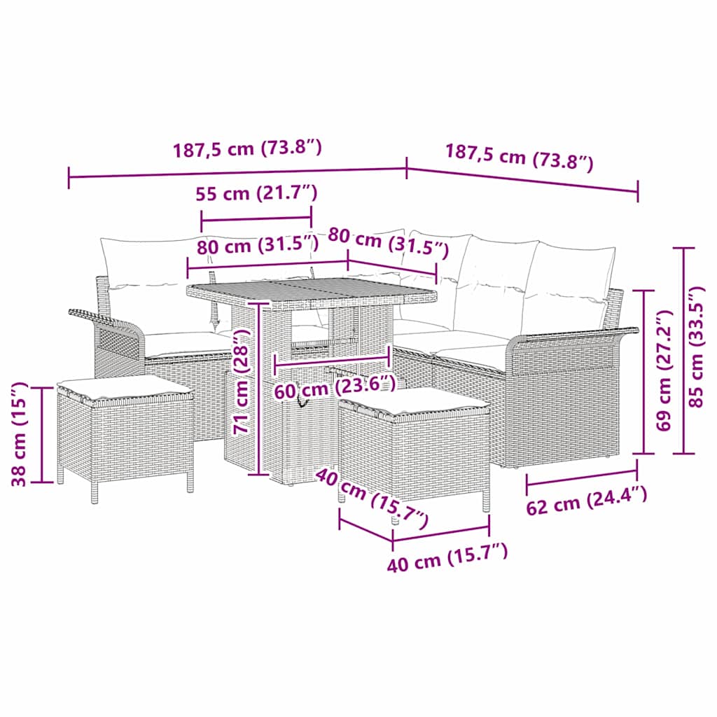 - Materiaal Samenstelling: Deze sofa set, gemaakt van kwaliteits-poly rattan en solide acaciahout, combineert duurzaamheid met een elegant ontwerp. Deze materialen zorgen voor een lange levensduur en stijl, waardoor het bestand is tegen de elementen en zowel functionaliteit als een tijdloze uitstraling behoudt.