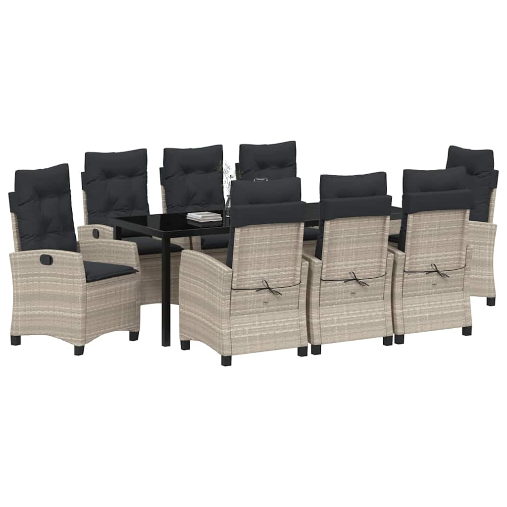 - Inclusief Componenten: De set heeft een tafelblad van gehard glas, ideaal voor een gladde, makkelijk schoon te maken tafel. Ook zitten er poly rattan armleuningen en een afgewerkte rugleuning bij voor zowel stijl als comfort. Elke stoel komt met een kussen voor extra zitten tijdens langere gebruiksperiodes.