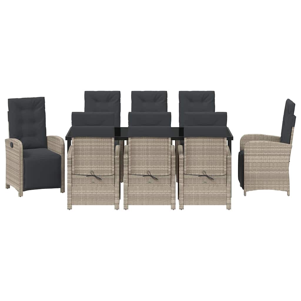Deze moderne eetset voor buiten maakt van elke buitenruimte een leuke eetplek die eenvoud en functionaliteit mooi samenbrengt. Ideaal voor zomerfeestjes, het poly rattan frame en glazen blad geven een strakke, eigentijdse uitstraling, terwijl het ook een flexibele opstelling voor sociale momenten met familie en vrienden biedt. Het ontwerp is perfect voor zowel relaxte maaltijden als levendige evenementen en sluit mooi aan bij het moderne tuinontwerp, waardoor je binnen- en buitenleven naadloos in elkaar overloopt.