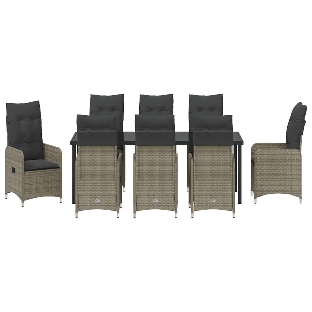 - Hoogwaardige materialen: Deze eetset is gemaakt van poly rattan, gehard glas en gepoedercoat staal, wat zorgt voor een perfecte mix van stijl en stevig materiaal. Het poly rattan maakt de moderne look compleet en biedt UV-bescherming, zodat alles er lang mooi uit blijft zien. Het gepoedercoat staal zorgt voor de sterke basis, zodat de set lang meegaat in je tuin.