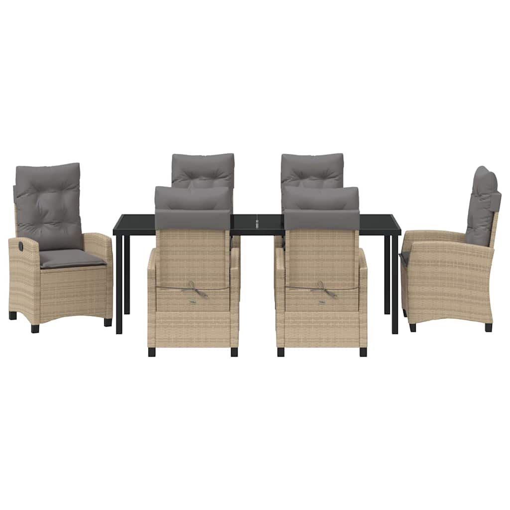 - Materialen: Gemaakt van poly rattan en sterk staal, wat deze eetset duurzaam en elegant maakt. Poly rattan biedt natuurlijke bescherming tegen UV-straling en weersomstandigheden, perfect voor zonnige plekken, terwijl het stalen frame zorgt voor stevigheid en stabiliteit voor jarenlang gebruik.