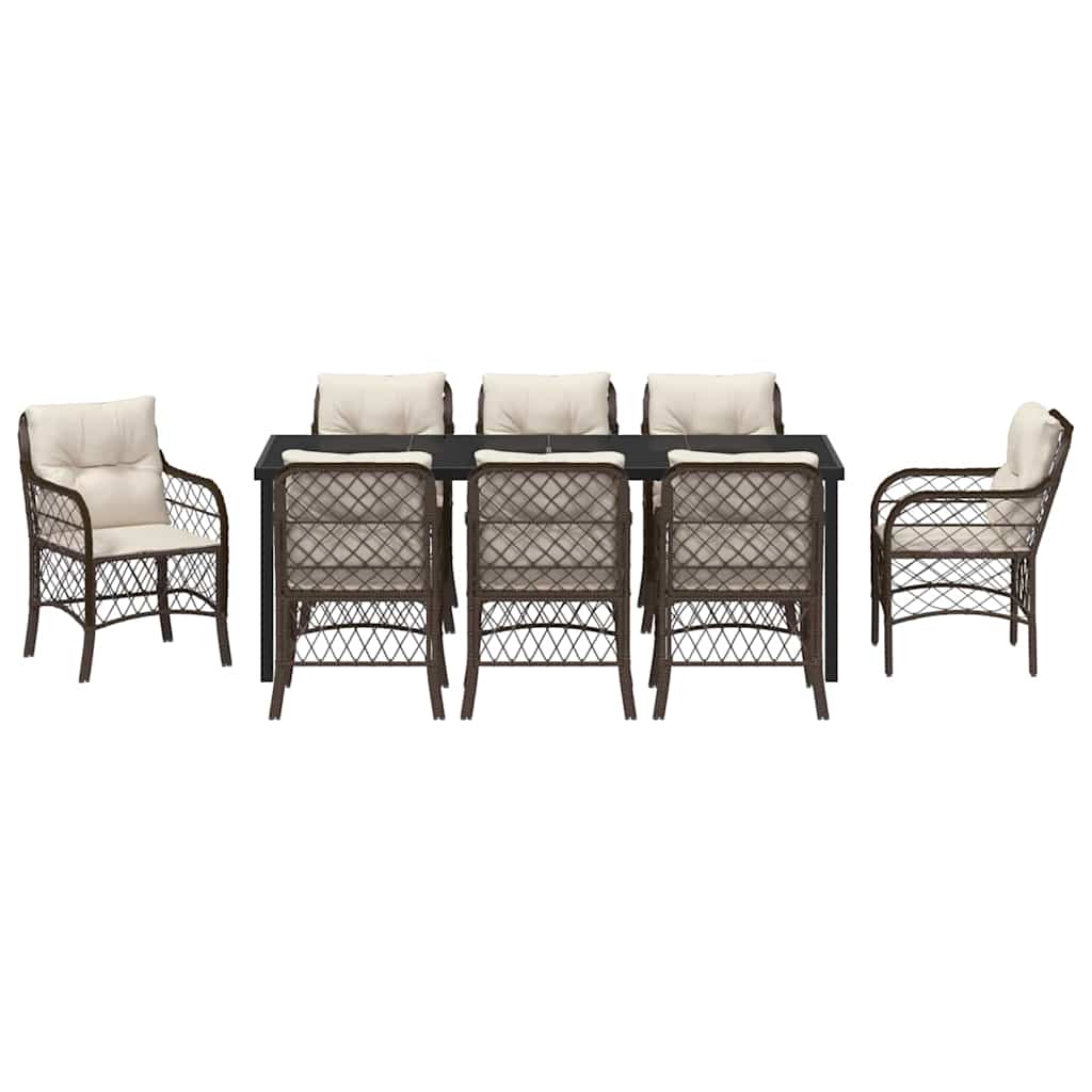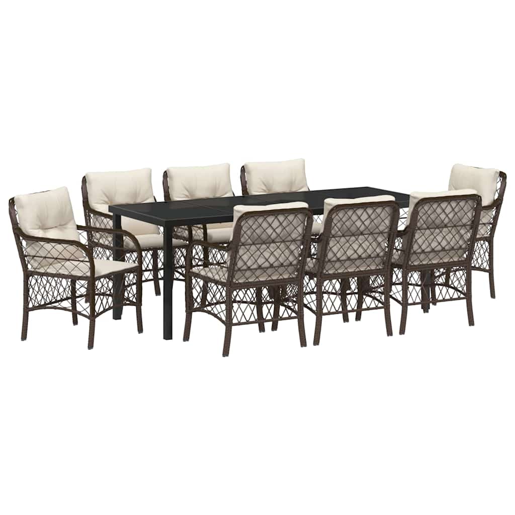 Deze Moderne Tuin Eettafel Set brengt elegantie naar je buitenruimte met zijn poedercoated stalen frame en poly rattan. De minimalistische stijl is perfect voor etentjes in de openlucht. De strakke lijnen maken het een uitnodigende tafel voor gezellige bijeenkomsten met familie en vrienden op zonovergoten terrassen of in je eigen tuin. Met deze set geef je sfeer en functionaliteit een boost, waardoor elke maaltijd buiten speciaal aanvoelt.