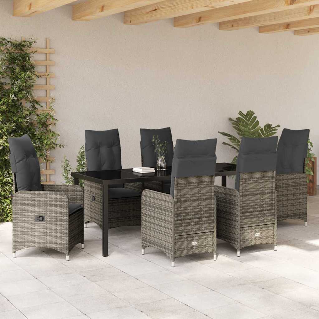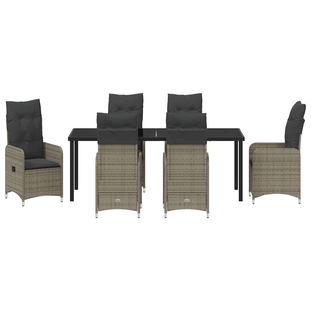 - Hoogwaardige materialen: Deze eetset is gemaakt van poly rattan, gehard glas en gepoedercoat staal, wat zorgt voor een perfecte mix van stijl en stevig materiaal. Het poly rattan maakt de moderne look compleet en biedt UV-bescherming, zodat alles er lang mooi uit blijft zien. Het gepoedercoat staal zorgt voor de sterke basis, zodat de set lang meegaat in je tuin.