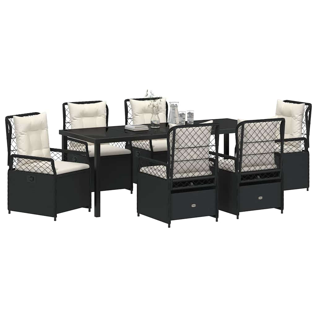 Deze moderne tuinset biedt een geweldige mix van stijl en functionaliteit voor buiten. Het is perfect voor al fresco dineren en bestaat uit een tafel met een gehard glazen blad en poly rattan stoelen met kussens. Ideaal voor iedereen die houdt van een comfortabele en stijlvolle buitenruimte, en maakt van elke tuin of terras een plek om te ontspannen.