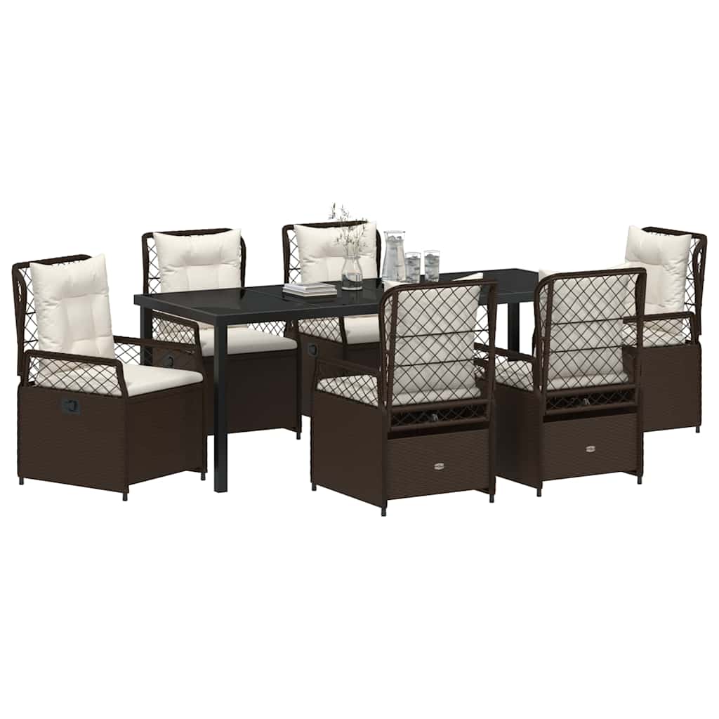 Deze moderne tuinset biedt een geweldige mix van stijl en functionaliteit voor buiten. Het is perfect voor al fresco dineren en bestaat uit een tafel met een gehard glazen blad en poly rattan stoelen met kussens. Ideaal voor iedereen die houdt van een comfortabele en stijlvolle buitenruimte, en maakt van elke tuin of terras een plek om te ontspannen.