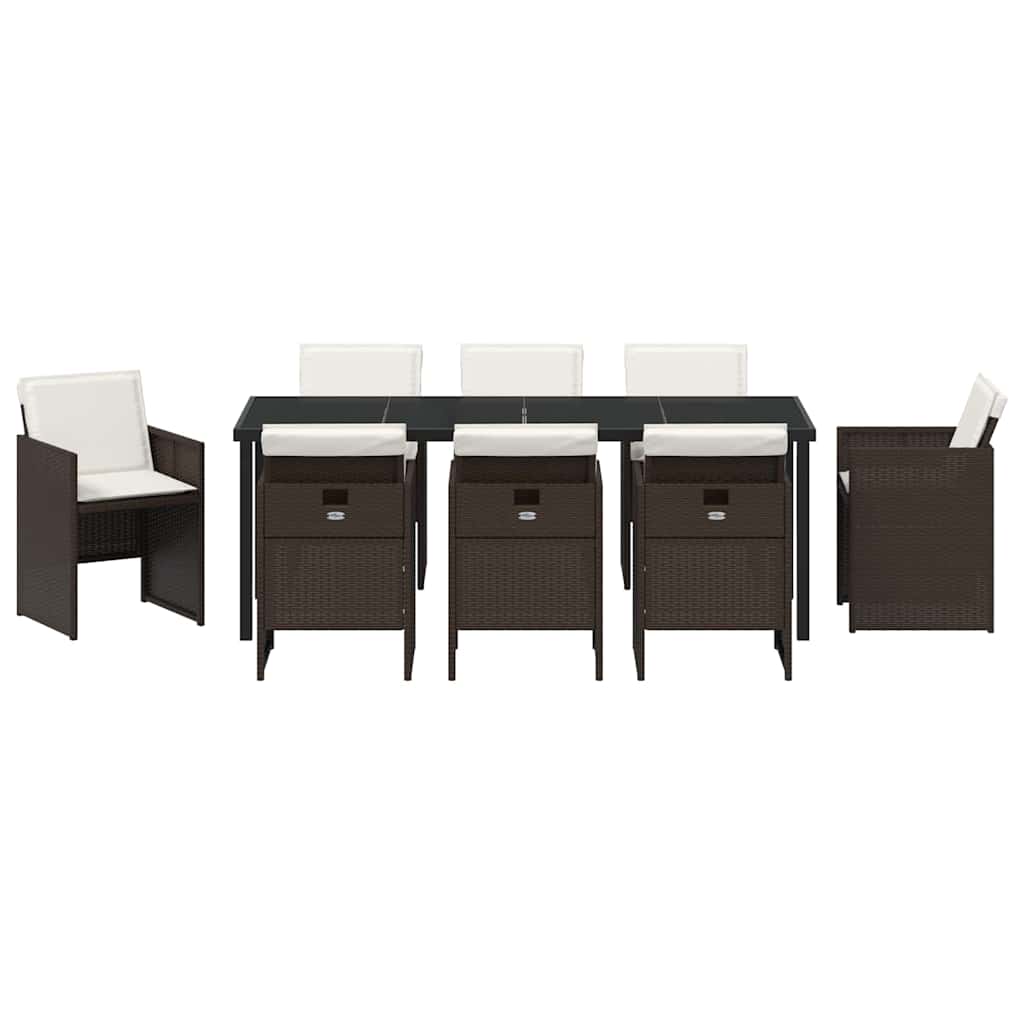 - Materialen: De set is opgebouwd uit poly rattan, dat bekend staat om zijn duurzaamheid en weerbestendigheid, perfect voor buiten. Het geharde glazen blad is stijlvol en makkelijk schoon te maken, en biedt functionaliteit zonder in te boeten op design. Het poedercoated staal maakt het frame en de poten extra stevig, zodat de set eenvoudig alle weersomstandigheden aankan en lang mee blijft gaan.