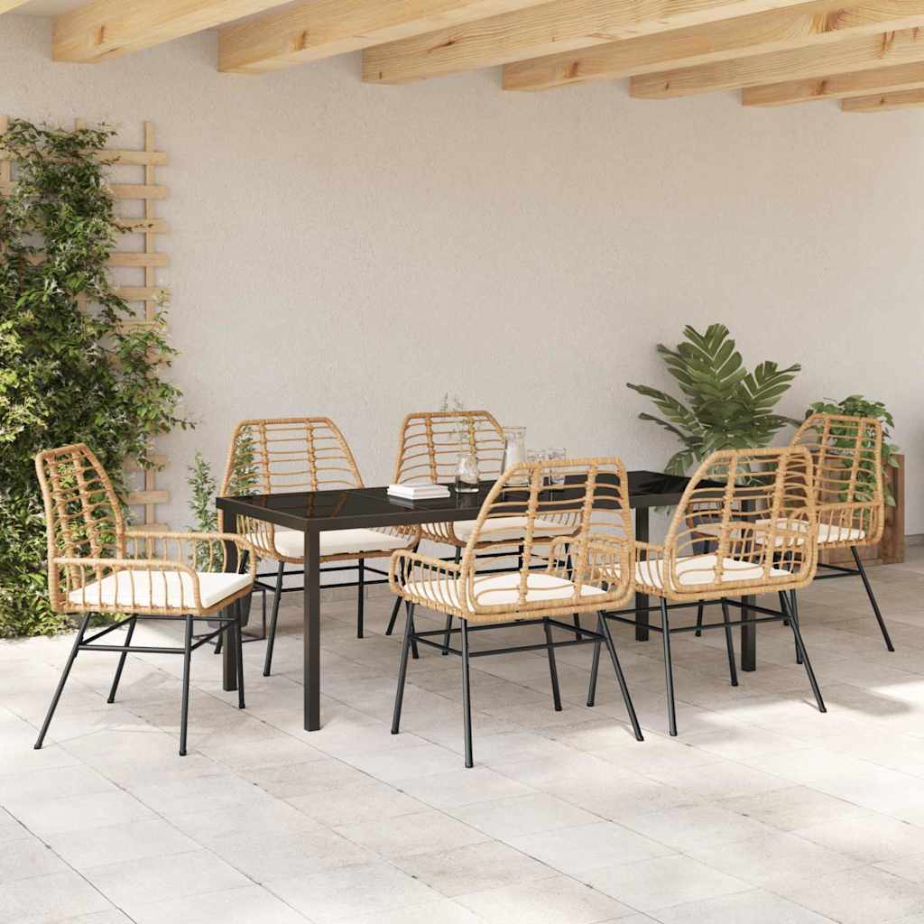 - Materialen: De basis van deze dining set is Poly Rattan, dat bekend staat om zijn lichte maar sterke eigenschappen. Het ziet er modern uit en is bestand tegen weer en wind, waardoor het zijn uitstraling en betrouwbaarheid behoudt. Het gepoedercoat stalen frame is robuust en biedt bescherming tegen water en slijtage.