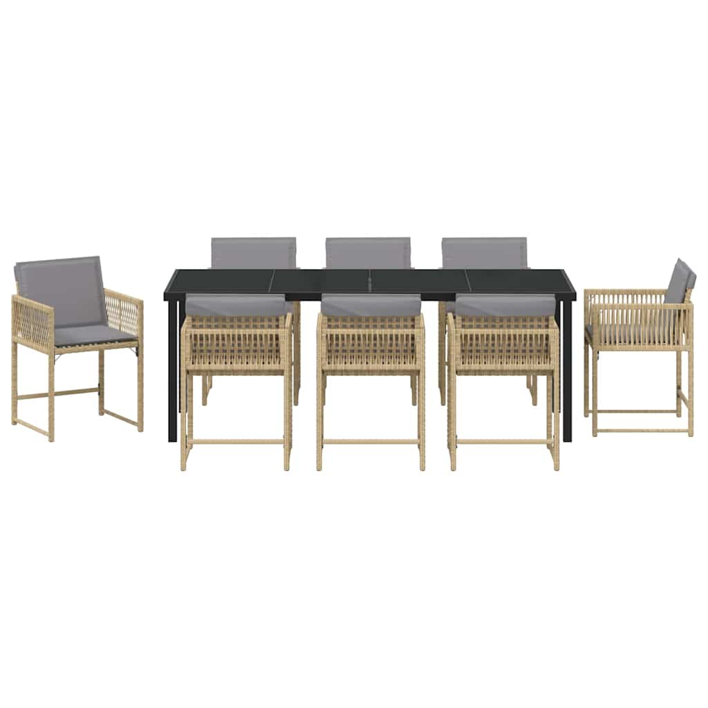 - Materialen: Deze dinerset is gemaakt van poly rattan en staal, wat zorgt voor een stoere, verfijnde uitstraling. Het poly rattan is duurzaam en bestand tegen alle weersomstandigheden, ideaal voor buiten. De stalen accenten geven extra stevigheid aan het ontwerp.