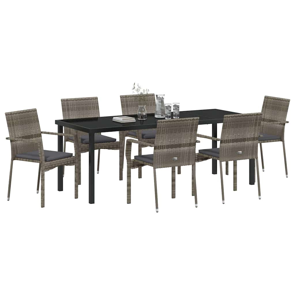 - Veelzijdige componenten: Met een gehard glazen tafelblad en weerbestendige kussens is deze set ideaal om buiten te eten zonder je zorgen te maken over schade. Het moderne materiaal van de zittingen en rug leent zich perfect voor elke tuin of terras.