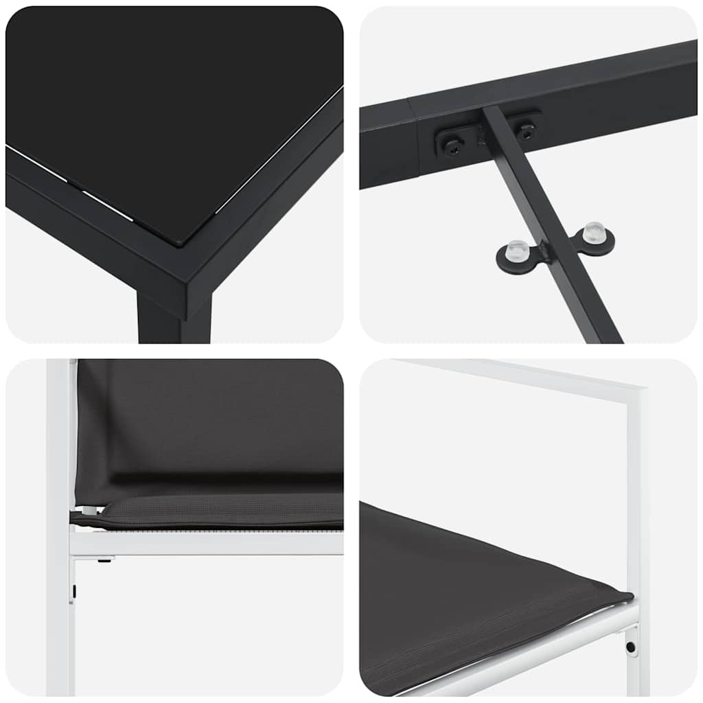- Materialen: De tuinset is gemaakt van Textilene stof, dat snel droogt en super stevig is voor langdurig comfort. Met gehard glas op de tafel krijg je een mooi en praktisch oppervlak. Het gepoedercoate staal zorgt ervoor dat de set bestand is tegen weer en wind en stabiel blijft tijdens elk samenzijn.