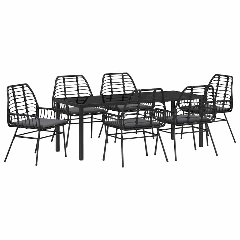 - Materialen: De basis van deze dining set is Poly Rattan, dat bekend staat om zijn lichte maar sterke eigenschappen. Het ziet er modern uit en is bestand tegen weer en wind, waardoor het zijn uitstraling en betrouwbaarheid behoudt. Het gepoedercoat stalen frame is robuust en biedt bescherming tegen water en slijtage.