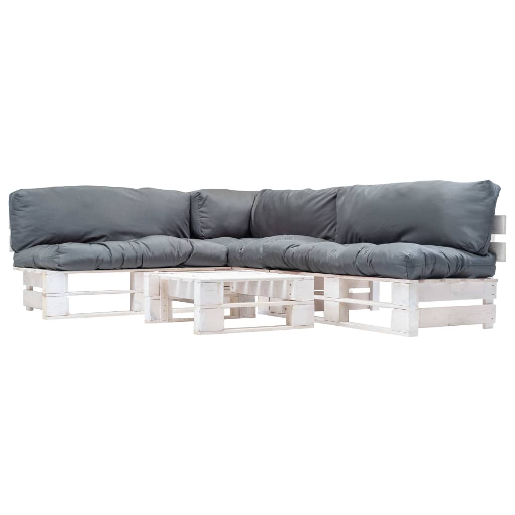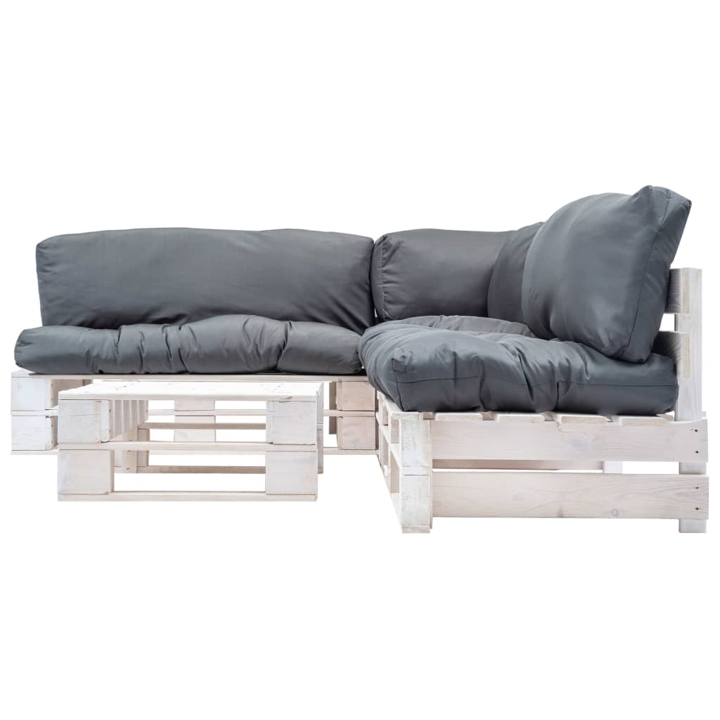 De levering bevat 2 tweezitsbanken, 1 tweezitshoekbank, 1 salontafel en afneembare zit- en rugkussens.