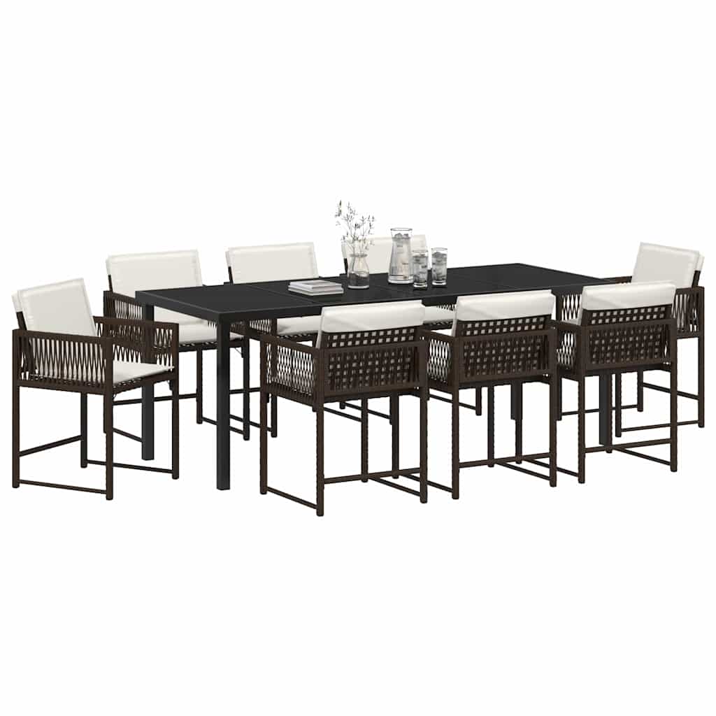 - Materialen: Deze dinerset is gemaakt van poly rattan en staal, wat zorgt voor een stoere, verfijnde uitstraling. Het poly rattan is duurzaam en bestand tegen alle weersomstandigheden, ideaal voor buiten. De stalen accenten geven extra stevigheid aan het ontwerp.