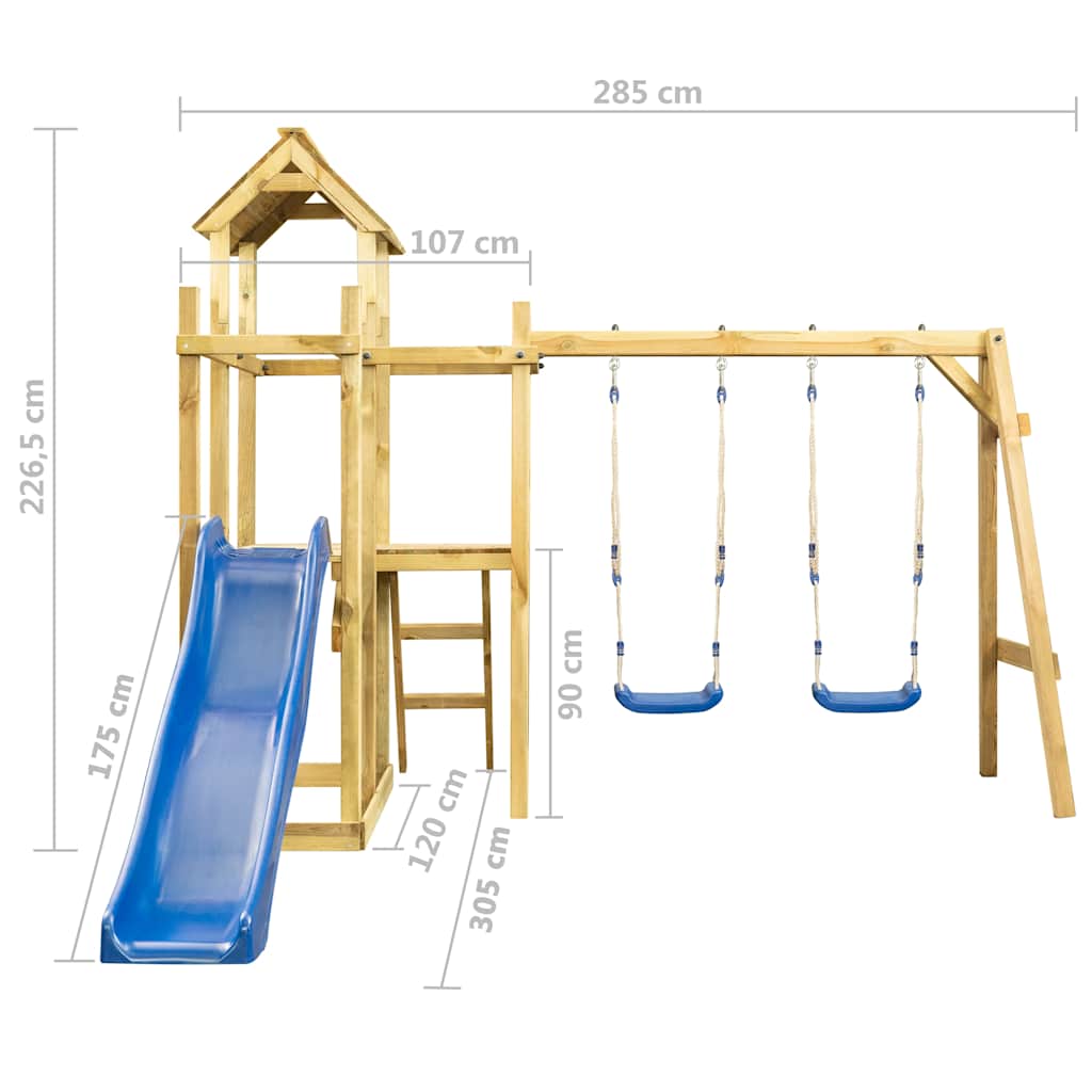 Het stevige frame is vervaardigd van geïmpregneerd grenenhout. Het masief houten speelhuis is extreem sterk, weerbestendig en duurzaam. De schommels worden met slijtvaste metalen haken aan het frame bevestigd en de kleurrijke handgrepen zorgen voor extra veiligheid. Ouders kunnen hun kinderen daarom zorgeloos laten spelen, helemaal omdat het speelhuis voldoet aan de meest actuele veiligheidsnormen. De speelhuisset heeft een massief houten frame, twee schommels, een klimladder en een platform. Je kleintjes kunnen ook hun vrienden uitnodigen om mee te doen.