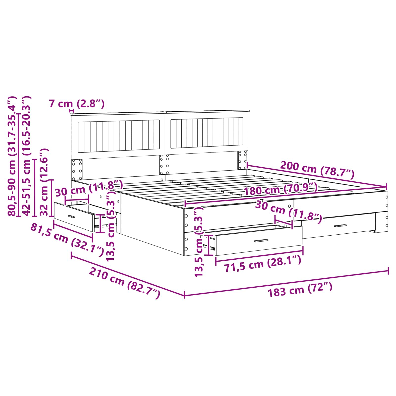 - Hoofdeinde maat: 183 x 7 x 90 Dimension_Unit (B x D x H)