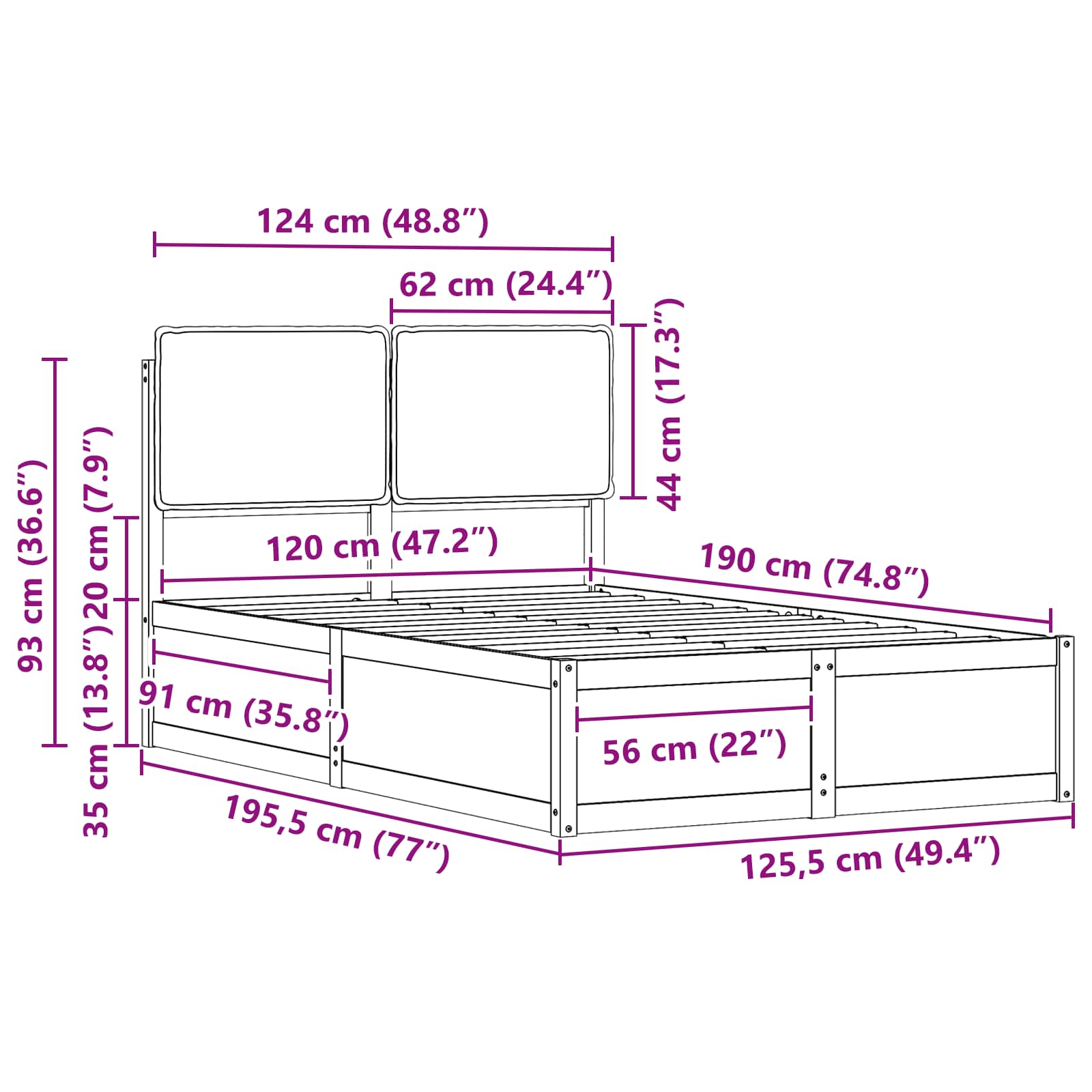 - Algemene afmetingen: 195,5 x 125,5 x 93 cm (L x B x H)
