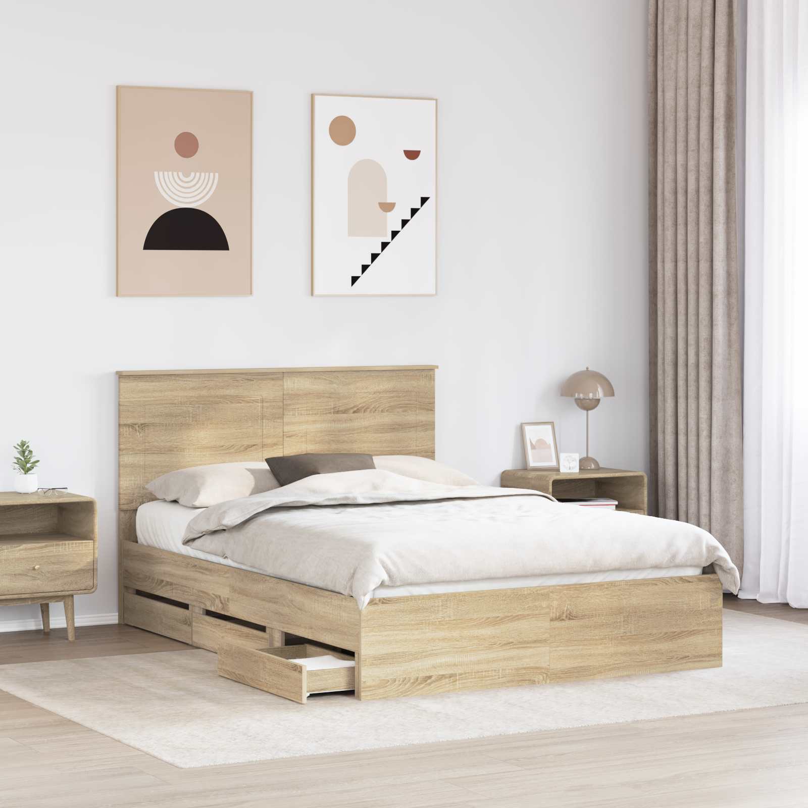 - Bewerkt hout constructie: Dit bedframe is helemaal gemaakt van duurzaam bewerkt hout, waardoor het bestand is tegen slijtage en dagelijks gebruik. Het materiaal is betrouwbaar, dus je bedframe blijft er fris uitzien en biedt jarenlang goede ondersteuning voor je matras.