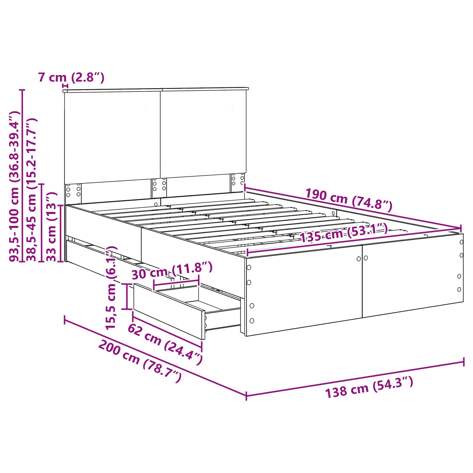 - Hoofdeinde maat: 138 x 7 x 100 cm (B x D x H)