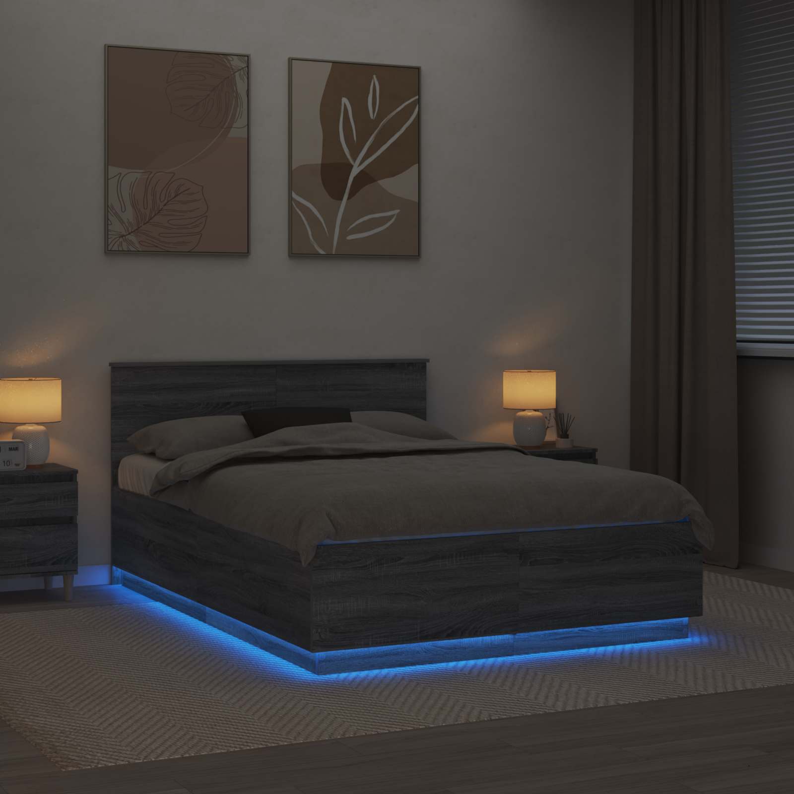 Dit moderne bedframe verandert je slaapkamer met zijn strakke en eigentijdse look. Het frame, met precisie gemaakt van bewerkt hout, heeft een schone, minimalistische uitstraling die perfect is voor elke moderne ruimte. Het is ontworpen om je slaapervaring te verbeteren, met een verstelbaar hoofdbord en rustgevende LED-verlichting voor een sfeervolle ambiance.