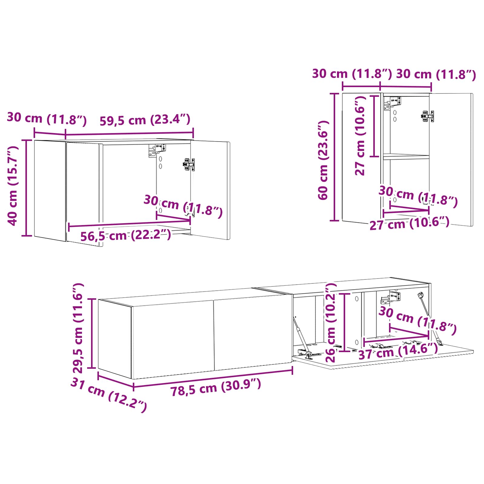 - 2 x TV wandkast: 78.5 x 30 x 29.5 cm (LxBxH)