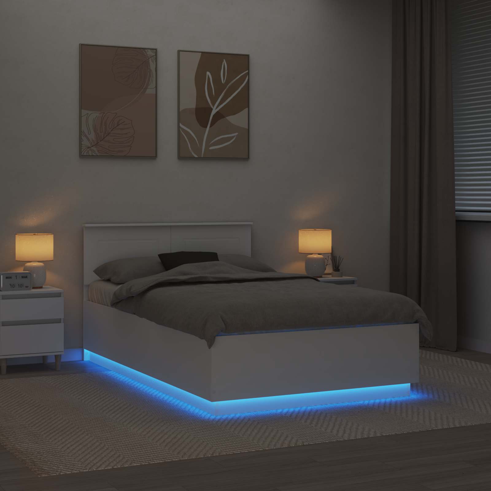 Dit moderne bedframe verandert je slaapkamer met zijn strakke en eigentijdse look. Het frame, met precisie gemaakt van bewerkt hout, heeft een schone, minimalistische uitstraling die perfect is voor elke moderne ruimte. Het is ontworpen om je slaapervaring te verbeteren, met een verstelbaar hoofdbord en rustgevende LED-verlichting voor een sfeervolle ambiance.
