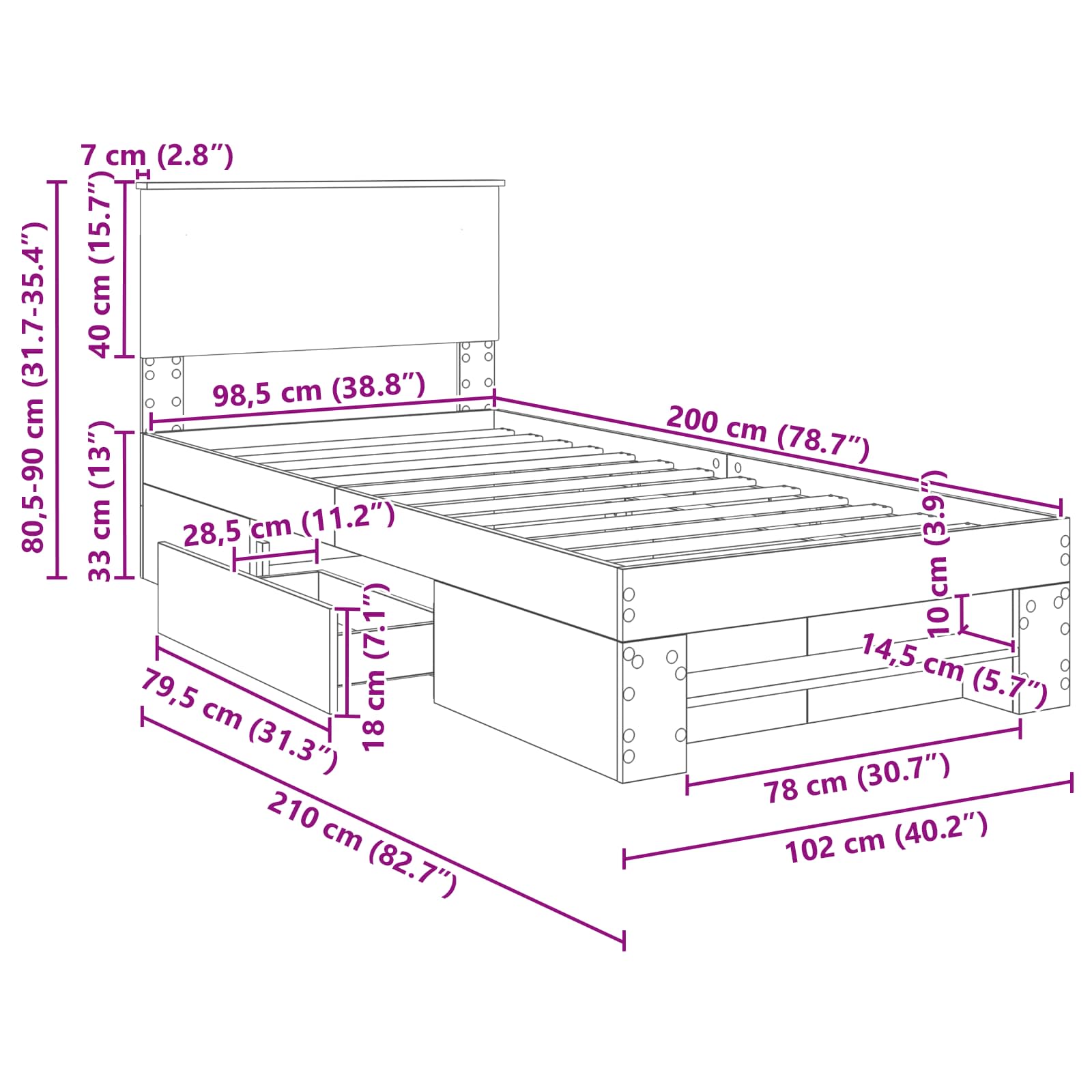 - Totale afmetingen: 210 x 102 x 90 cm (L x B x H)