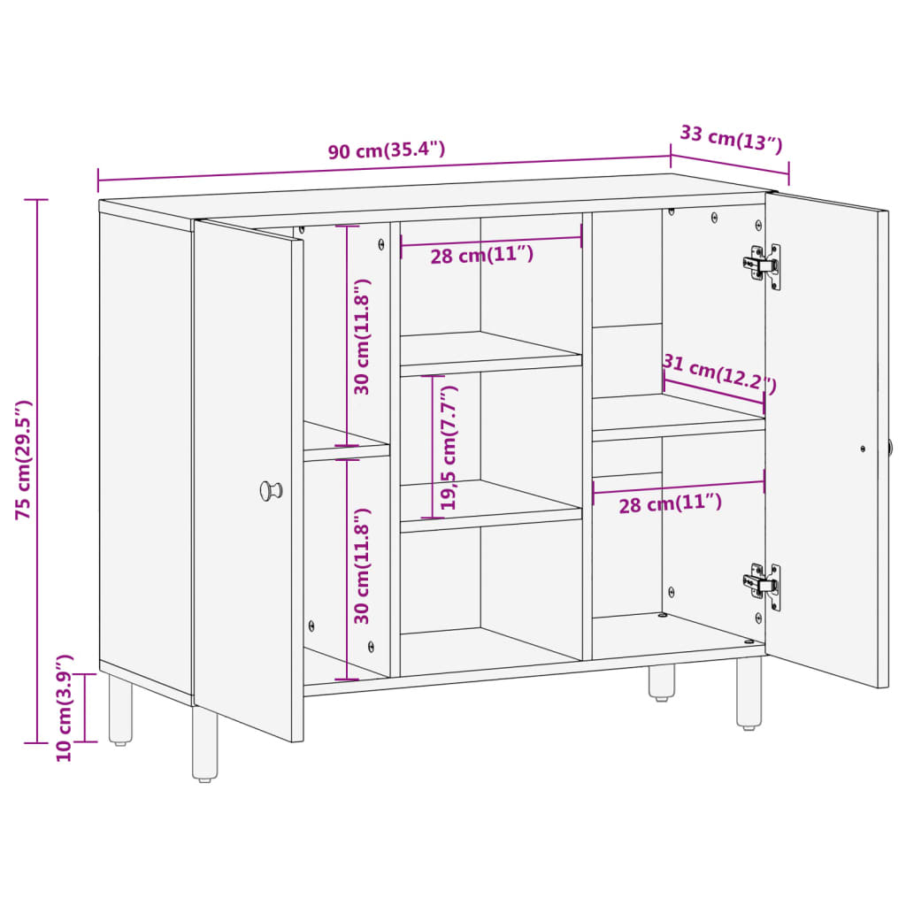 - Massief mangohout: massief mangohout is een sterk, tropisch hardhout waar stevige meubelen van gemaakt worden. De prachtige houtnerven maken elk meubelstuk net even anders dan de rest. De kast is van massief mangohout gemaakt en is duurzaam en stabiel.