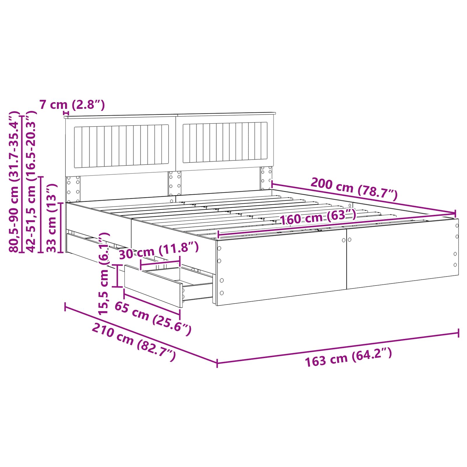 - Hoofdeinde maat: 163 x 7 x 90 cm (B x D x H)