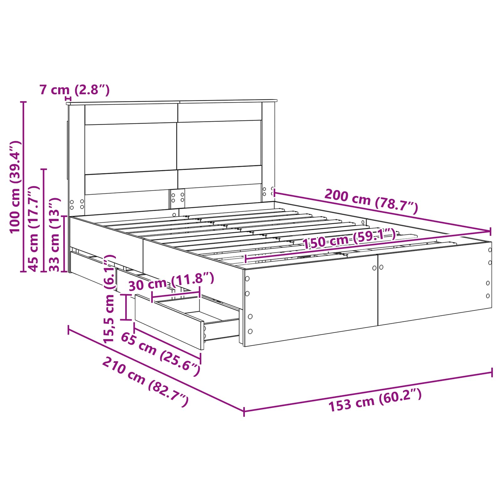 - Hoofdeinde maat: 153 x 7 x 100 cm (B x D x H)