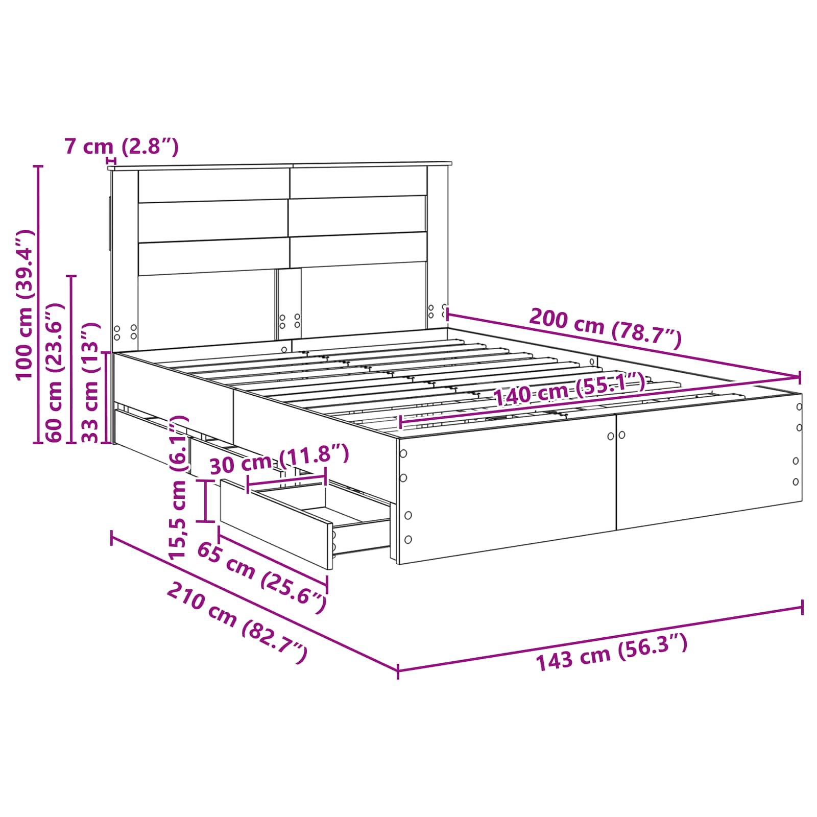 - Hoofdeinde maat: 143 x 7 x 100 cm (B x D x H)