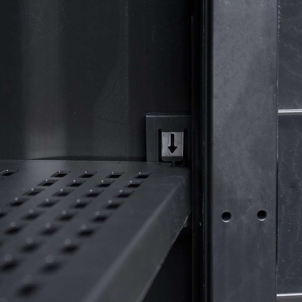 Deze TÜV-GS gecertificeerde kast is gemaakt van stevig en duurzaam polypropyleen (PP). De ruime kast heeft geventileerde schappen die versteld kunnen worden om ruimte te bieden aan spullen van verschillende groottes. De tuinkast kan afgesloten worden met een hangslot voor extra veiligheid (het slot wordt niet meegeleverd).