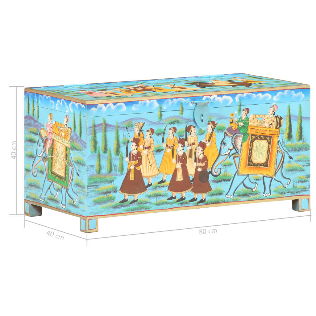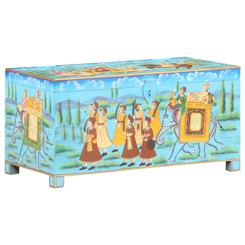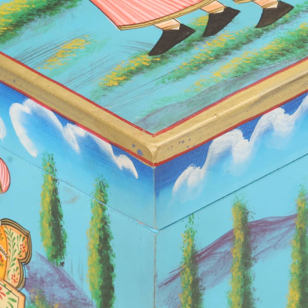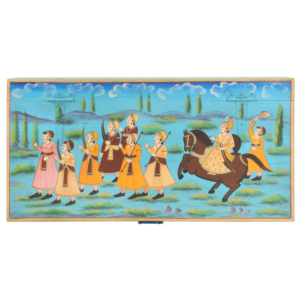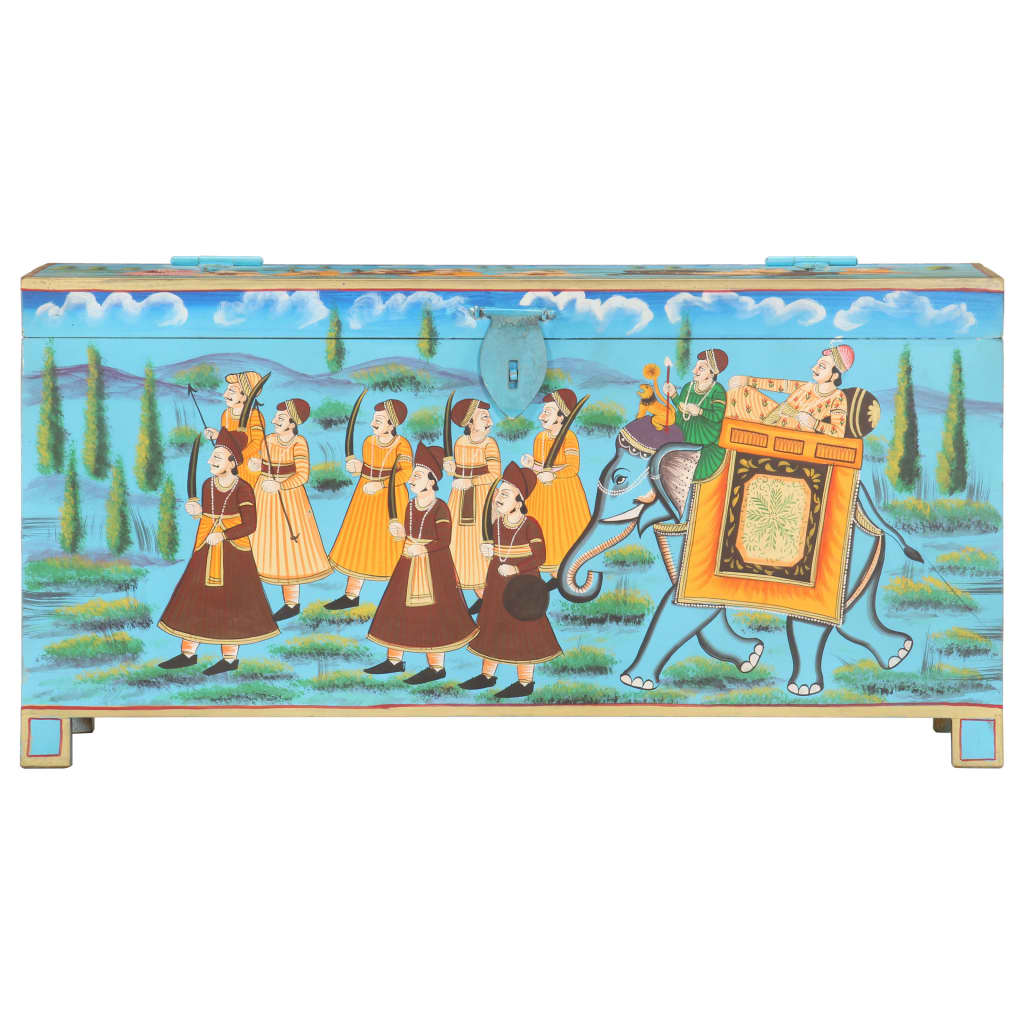 Deze opbergbox is gemaakt van massief tropisch mangohout en MDF, dat extreem duurzaam en stabiel is. De geheel handgeschilderde afbeelding, die het oppervlak van de box bedekt, maakt de box echt een prachtig kunstwerk. Je ziet de Aziatische Maharadja die zijn land op een olifant verkent samen met zijn leger. Elk proces van polijsten, schilderen en lakken is uitvoerig voorbereid.