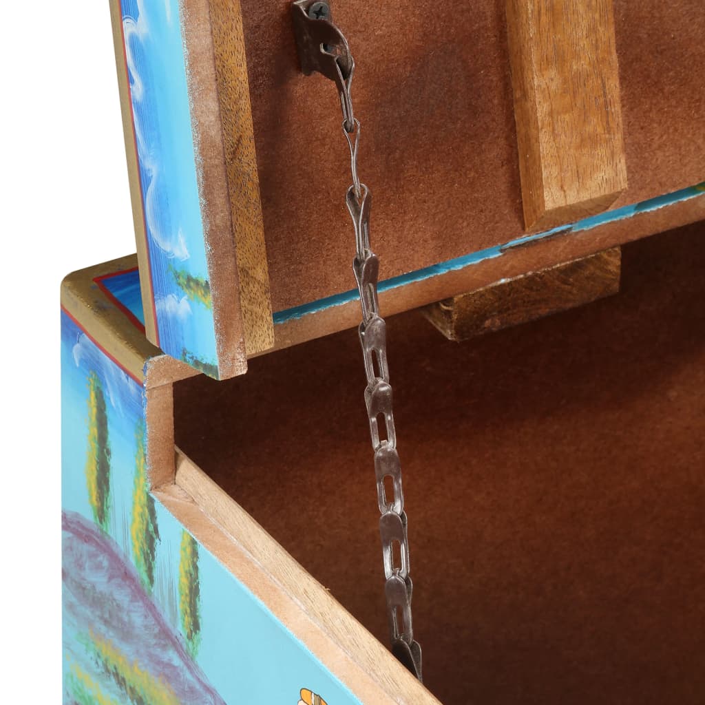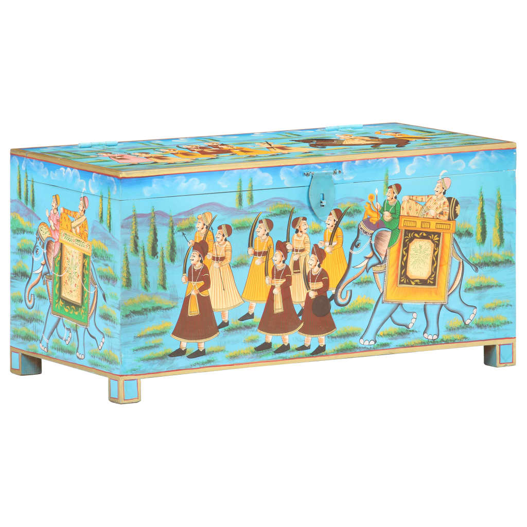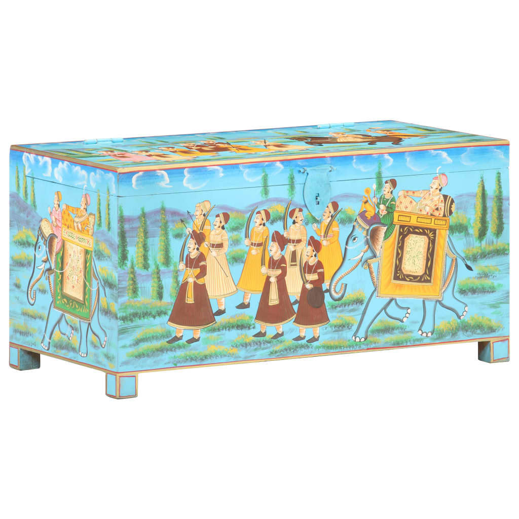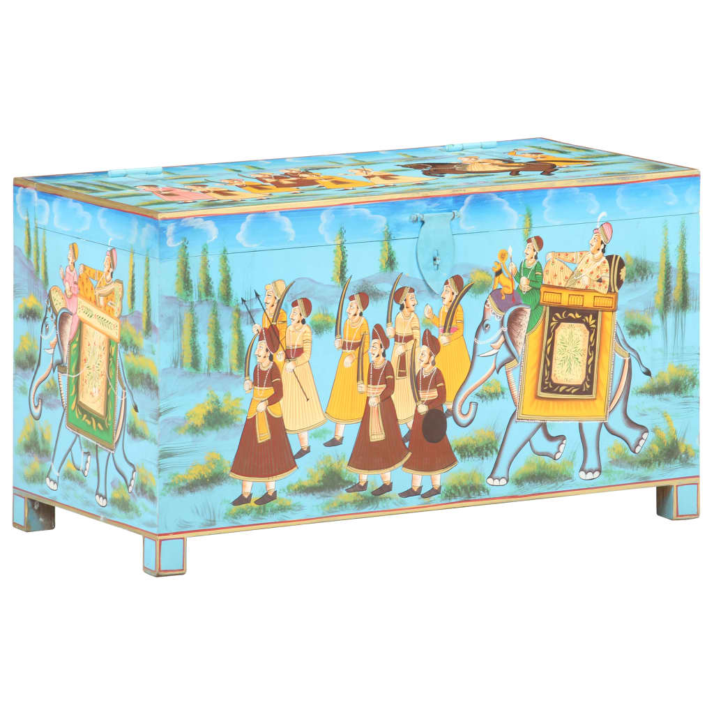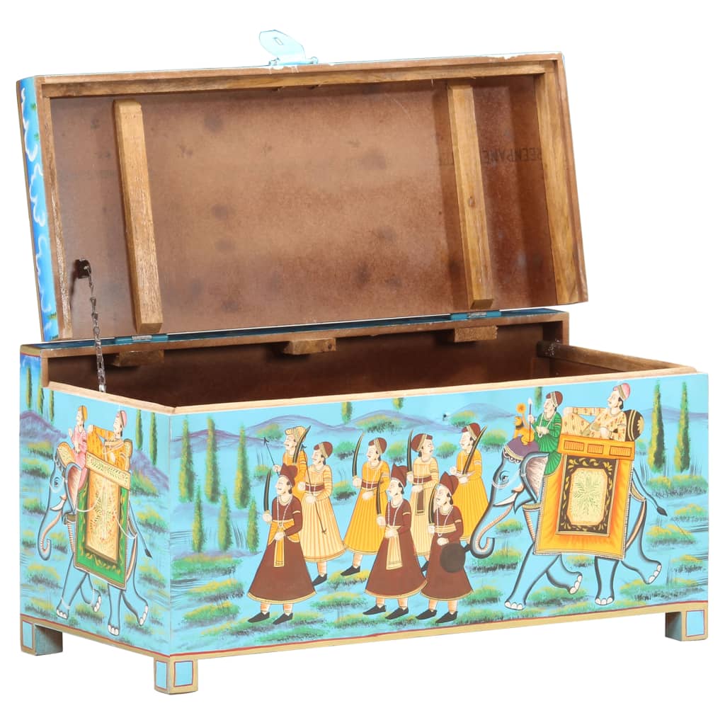 Deze opbergbox is gemaakt van massief tropisch mangohout en MDF, dat extreem duurzaam en stabiel is. De geheel handgeschilderde afbeelding, die het oppervlak van de box bedekt, maakt de box echt een prachtig kunstwerk. Je ziet de Aziatische Maharadja die zijn land op een olifant verkent samen met zijn leger. Elk proces van polijsten, schilderen en lakken is uitvoerig voorbereid.