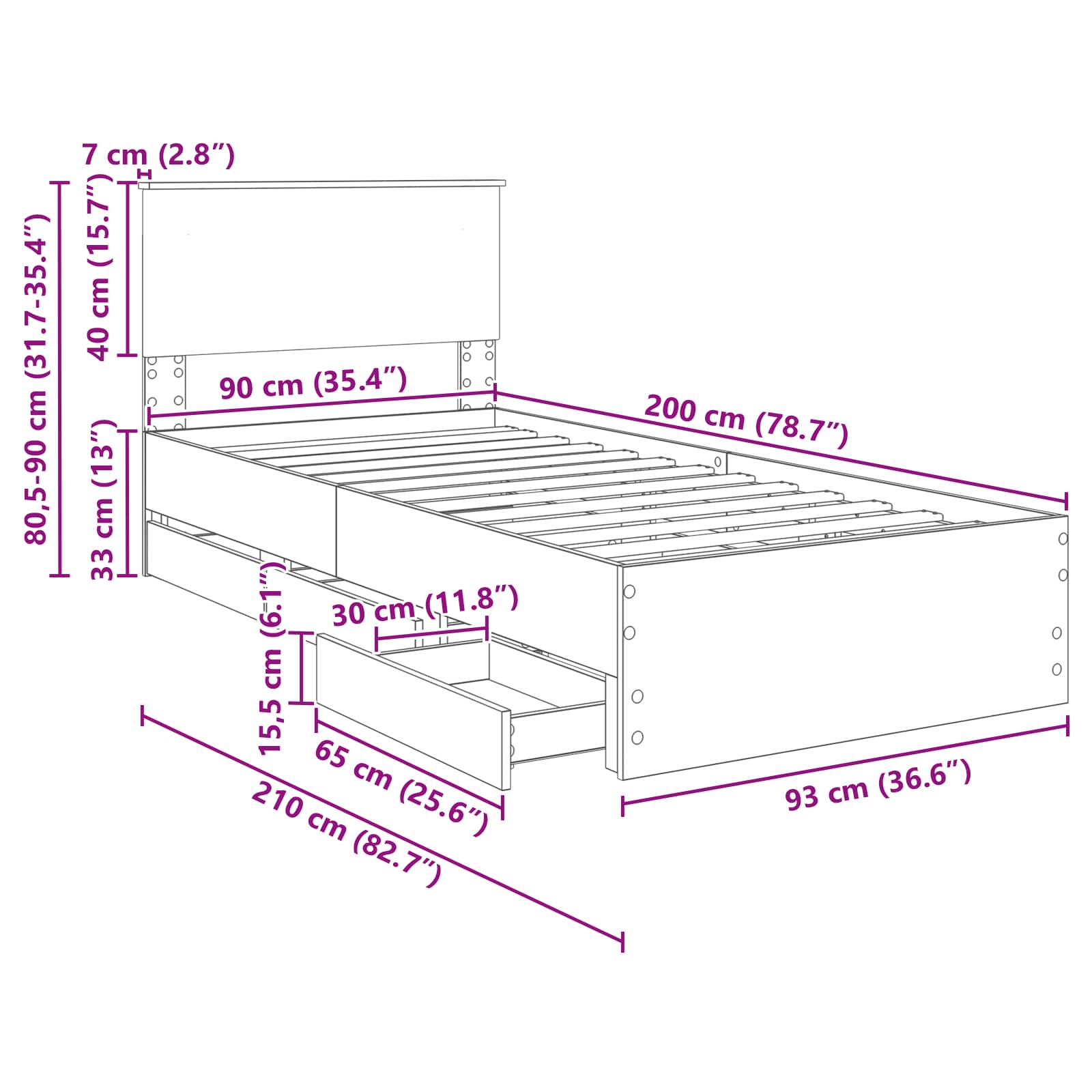 - Hoofdeinde maat: 93 x 7 x 90 cm (B x D x H)