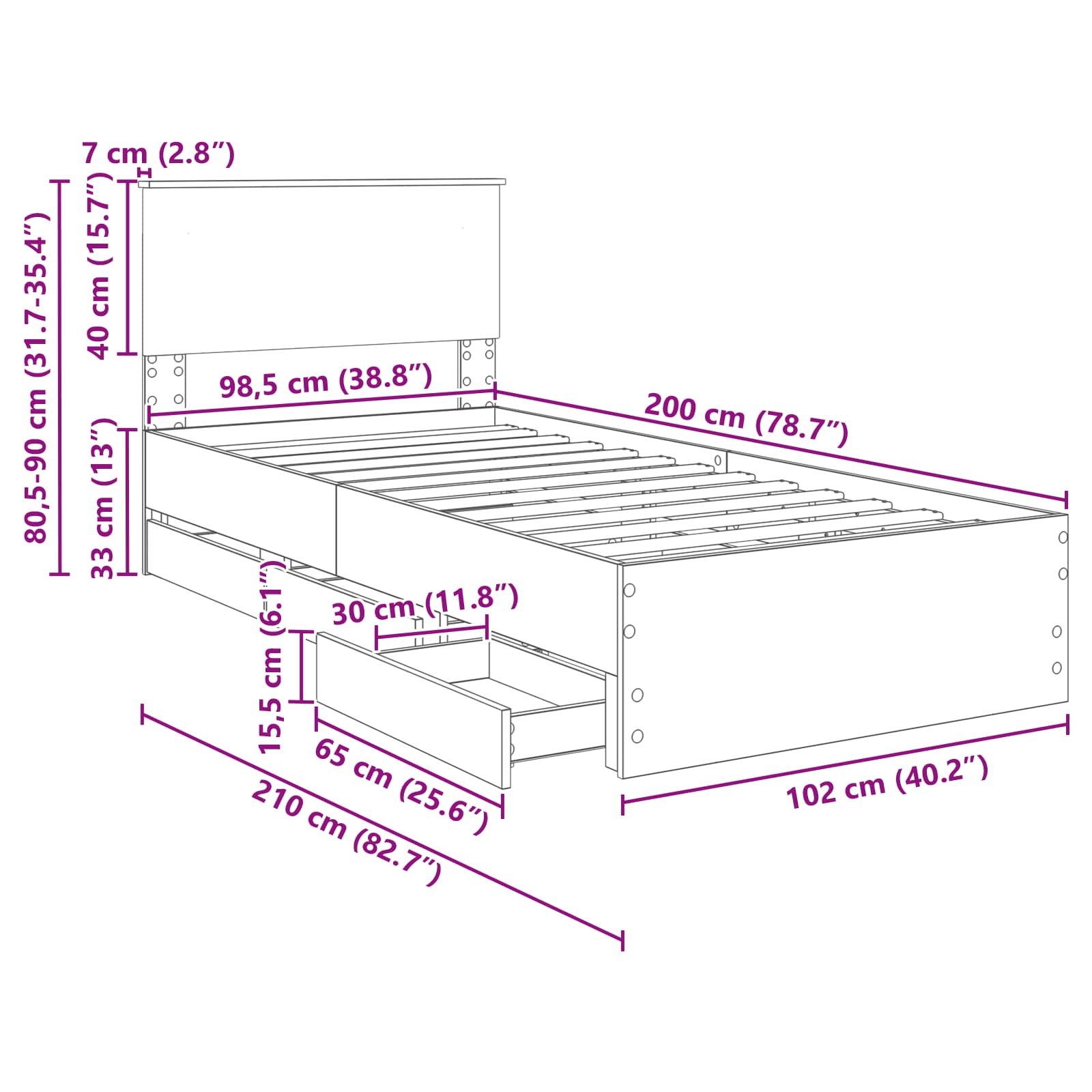 - Hoofdeinde maat: 102 x 7 x 90 cm (B x D x H)