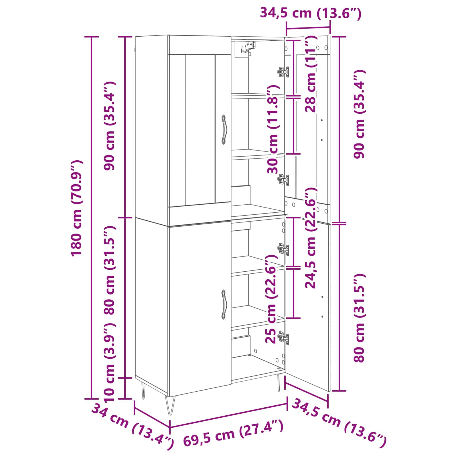 - Totale afmetingen: 69,5 x 34 x 180 cm (L x B x H)