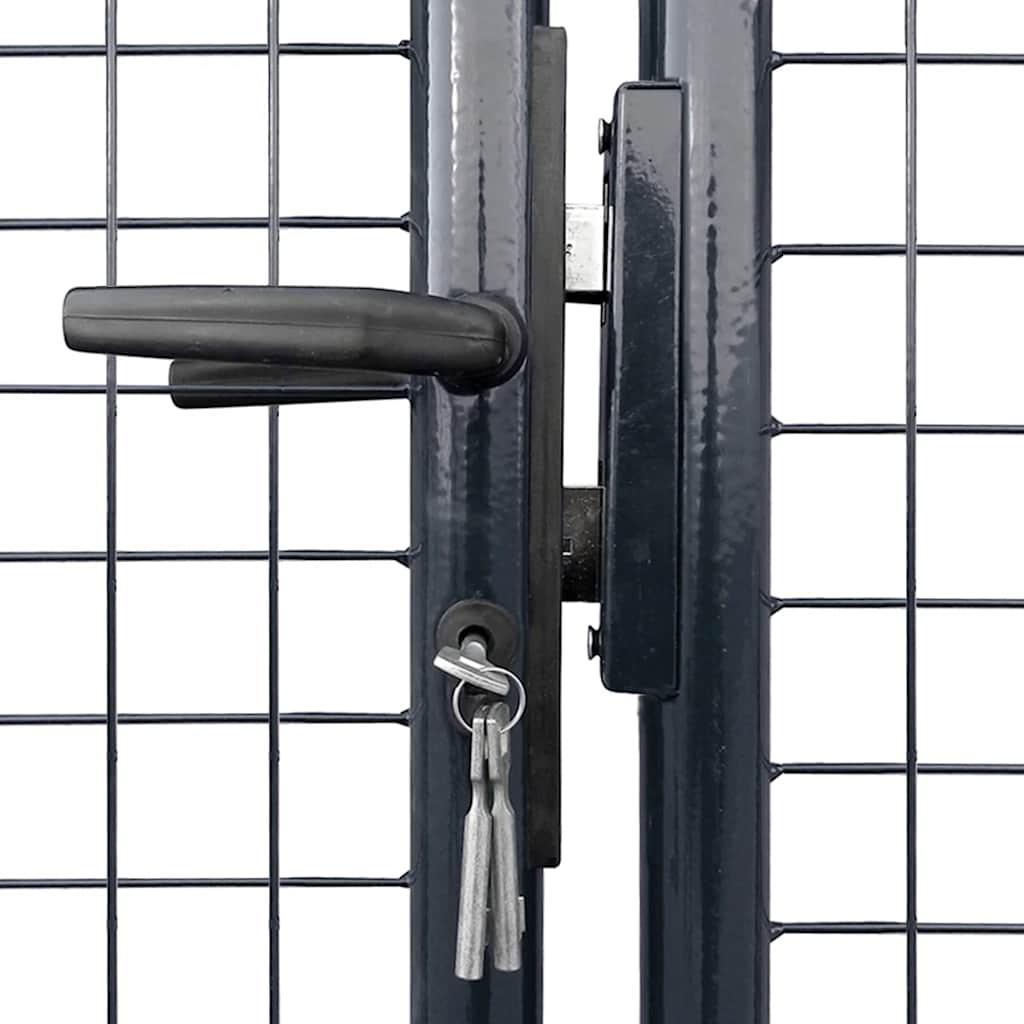 De poort is hoogwaardig afgewerkt en vervaardigd uit gegalvaniseerd staal met een gepoedercoate afwerking die roestbestendig is en een stevige constructie vormt. HIj heeft twee zijpalen met boutscharnieren, zodat je de poort eenvoudig kunt installeren. Er zit ook een grondpin bij voor de grote bodembout, zodat de poort goed afgesloten kan worden.