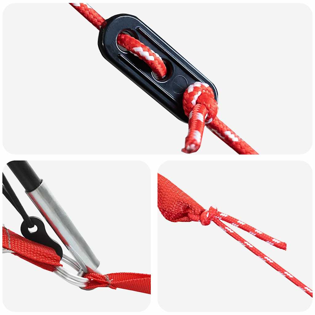 - Volledige kampeerconfiguratie Je krijgt een tentzeil, een afneembare regenhuif, een stevige set stokken, een handige draagtas, lijnen voor extra stabiliteit en grondpinnen om alles goed vast te zetten. Elk onderdeel zorgt ervoor dat je gemakkelijk en stressvrij kunt kamperen.