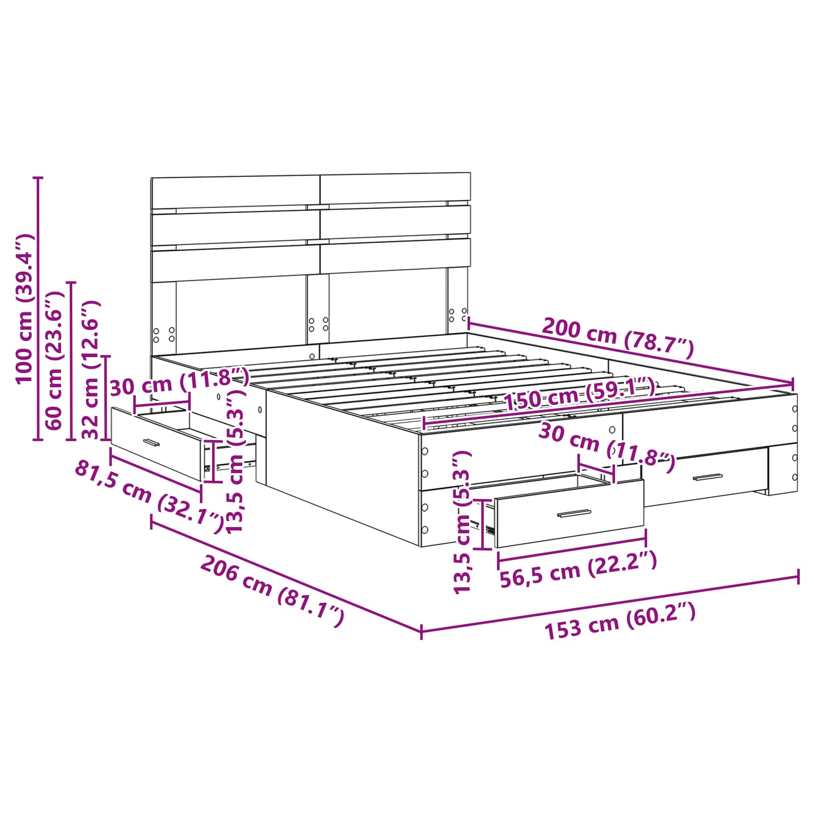 - Ergonomische handgrepen: De lades zijn voorzien van metalen handgrepen die soepel werken. Deze handgrepen combineren stijl met functionaliteit, waardoor het ontwerp van het bed totaal af is.
